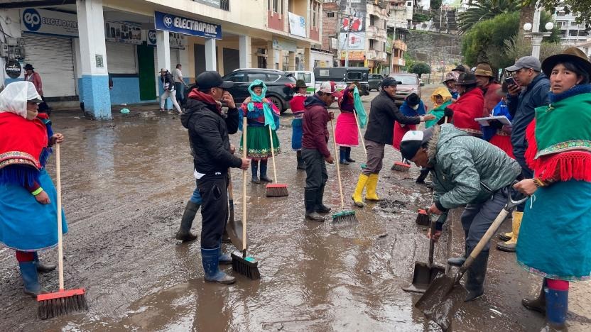 Las tareas de remoción de escombros y limpieza se mantienen este jueves 19 de febrero de 2026 en el cantón Alausí, en la provincia de Chimborazo, tras el aluvión provocado por las fuertes precipitaciones registradas el pasado viernes.