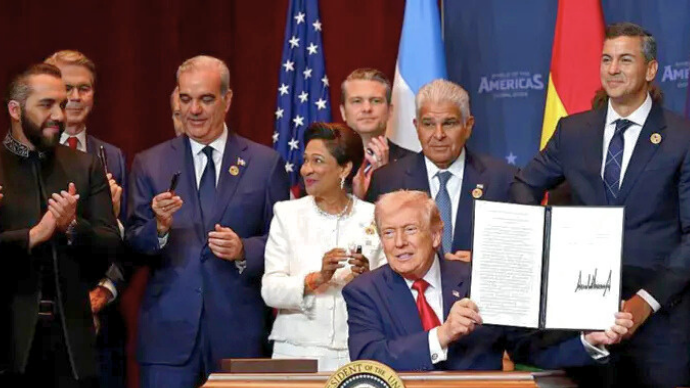 La imagen de Trump, sentado detrás del escritorio y rodeado de mandatarios latinoamericanos de pie, simboliza el alineamiento de estos países con Estados Unidos, a quienes el secretario de Estado Marco Rubio llamó «amigos».